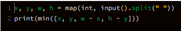 한수는 지금 (x, y)에 있다. 직사각형은 각 변이 좌표축에 평행하고, 왼쪽 아래 꼭짓점은 (0, 0), 오른쪽 위 꼭짓점은 (w, h)에 있다. 직사각형의 경계선까지 가는 거리의 최솟값을 구하는 프로그램