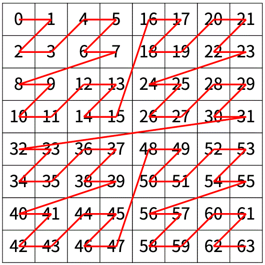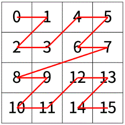 - 다음 예는 2^2× 2^2크기의 배열을 방문한 순서이다.