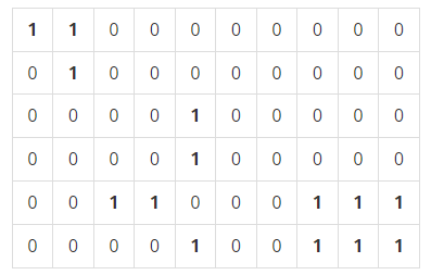 - 한나가 배추를 재배하는 땅은 고르지 못해서 배추를 군데군데 심어 놓았다. 배추들이 모여있는 곳에는 배추흰지렁이가 한 마리만 있으면 되므로 서로 인접해있는 배추들이 몇 군데에 퍼져있는지 조사하면 총 몇 마리의 지렁이가 필요한지 알 수 있다. 예를 들어 배추밭이 아래와 같이 구성되어 있으면 최소 5마리의 배추흰지렁이가 필요하다. 0은 배추가 심어져 있지 않은 땅이고, 1은 배추가 심어져 있는 땅을 나타낸다.