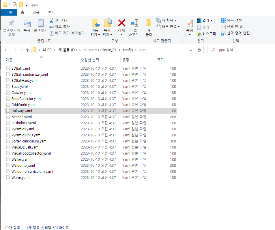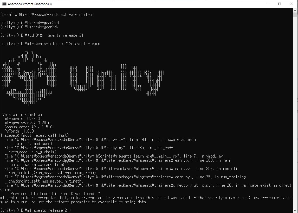 mlagents-learn "D:\ml-agents-release_21\config\ppo\Hallway.yaml" --run-id=test(이름) --force