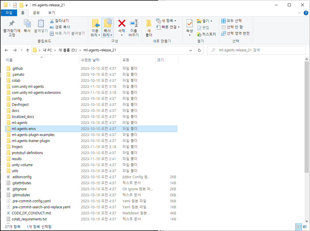 위 github 주소에서 ml-agents 예제 파일을 다운받아 줍니다.